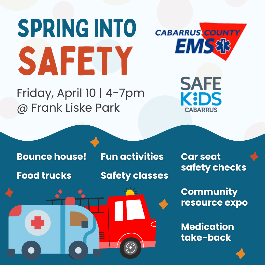 Join Safe Kids Cabarrus at the Spring Into Safety Event hosted by Cabarrus County EMS at Frank Liske Park on Friday, April 10, 4:00-7:00pm! Car seat checks Bounce House Medication Take-Back Resource Expo Food Trucks Safety Classes Fun activities!